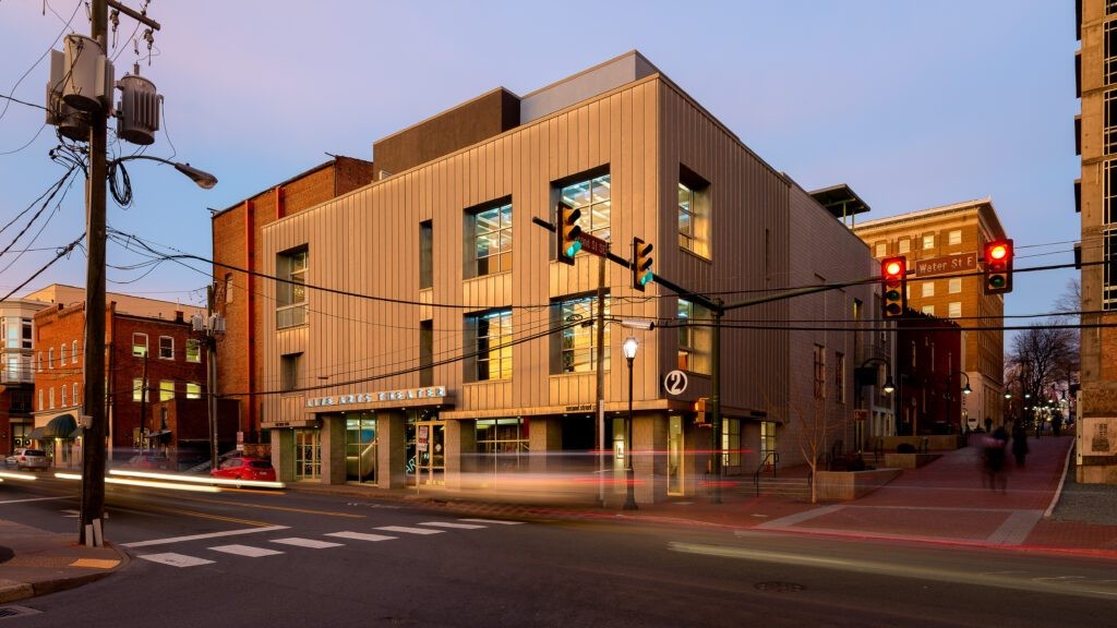 Live Arts is located just one block off the Downtown Mall, adjacent to the Water Street Garage. Our four-story building contains two fully functioning theaters, meeting and rehearsal rooms, an expansive wrap-around terrace with great views of the sunset, and an elegant, open third floor lobby with a built-in bar and comfortable seating. When not in use for productions or year-round education programming, these spaces are available for rent at affordable rates. If you are looking for a place to have a special event, a retirement party, a happy hour, or a rehearsal dinner, consider Live Arts!