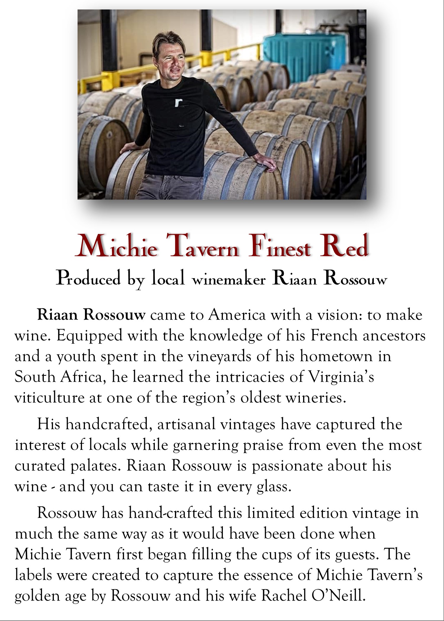 Find a great selection of Virginia-made products, such as Michie Tavern's Finest Red and Charlottesville favorites Allen’s Scottish Shortbread, Valente Pasta, and Toute Petite stationery.