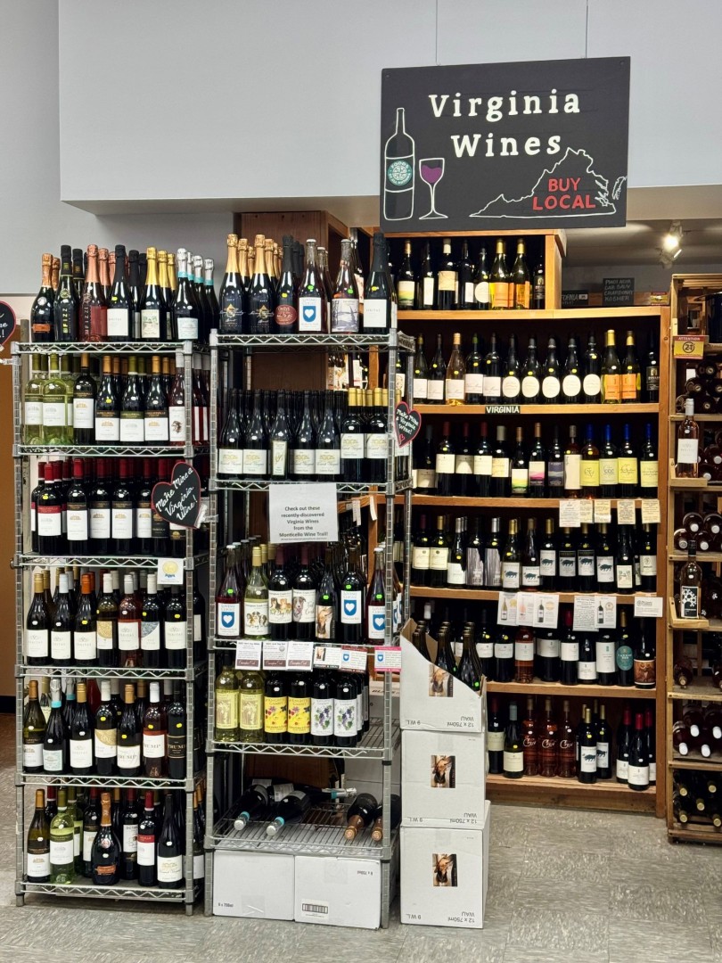 Discover our carefully curated wine selection, ranging from local Virginia vineyards to celebrated international labels and hidden gems. We take pride in offering one of the best selections in Charlottesville, including an extensive range of sake, non-alcoholic and Kosher wines. Whether pairing with dinner or celebrating a special occasion, we provide options to suit every budget and palate. Customers are always welcome to ask for Hope, our resident "Wine Lady," for personalized recommendations.