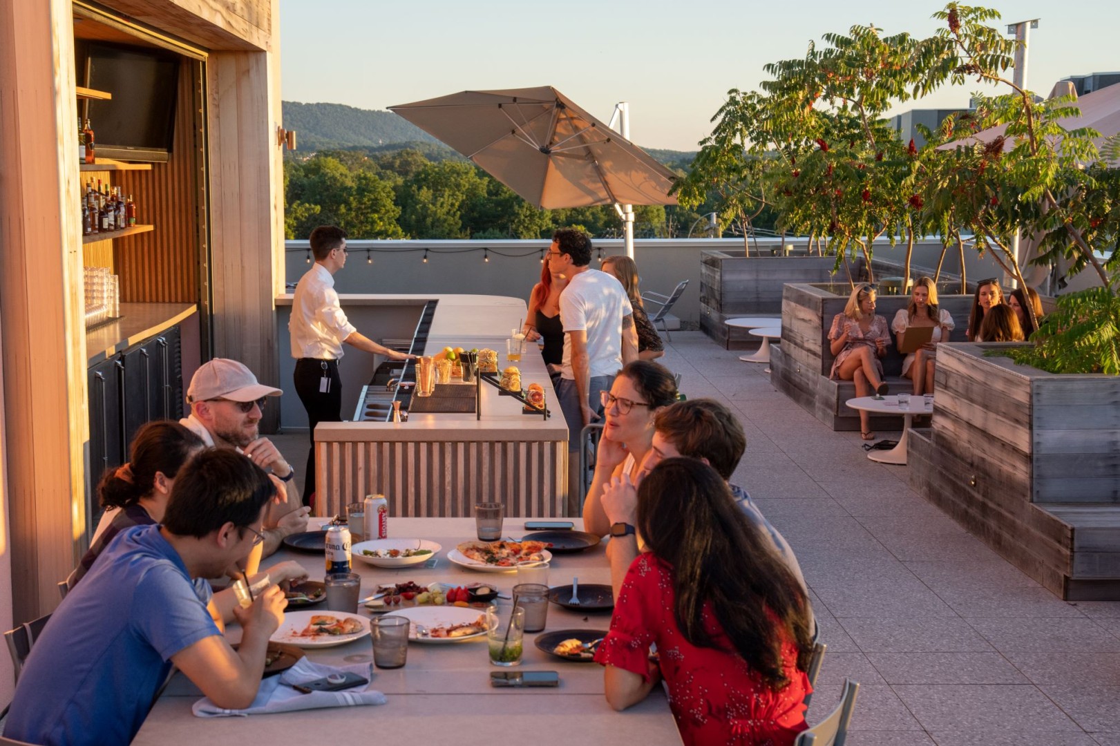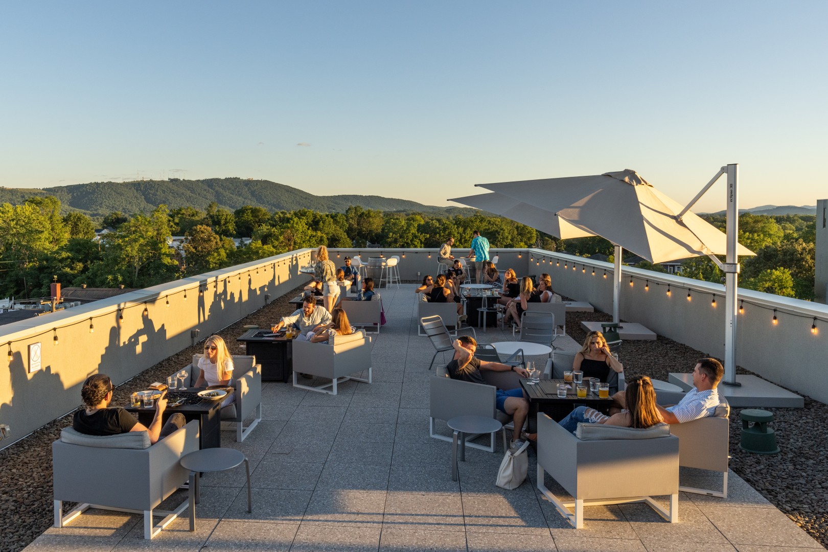 Perched above The Doyle Hotel, between The Corner and The Downtown Mall, and boasting unparalleled panoramic views of Virginia Wine Country and the Blue Ridge Mountains beyond, Rooftop Charlottesville is a one-of-a-kind experience. Featuring reimagined, upscale bar bites that highlight locally sourced, seasonal ingredients alongside a progressive cocktail program, regional craft beers and worldly wines, our rooftop welcomes both locals and visitors to sip and savor the best of Charlottesville.