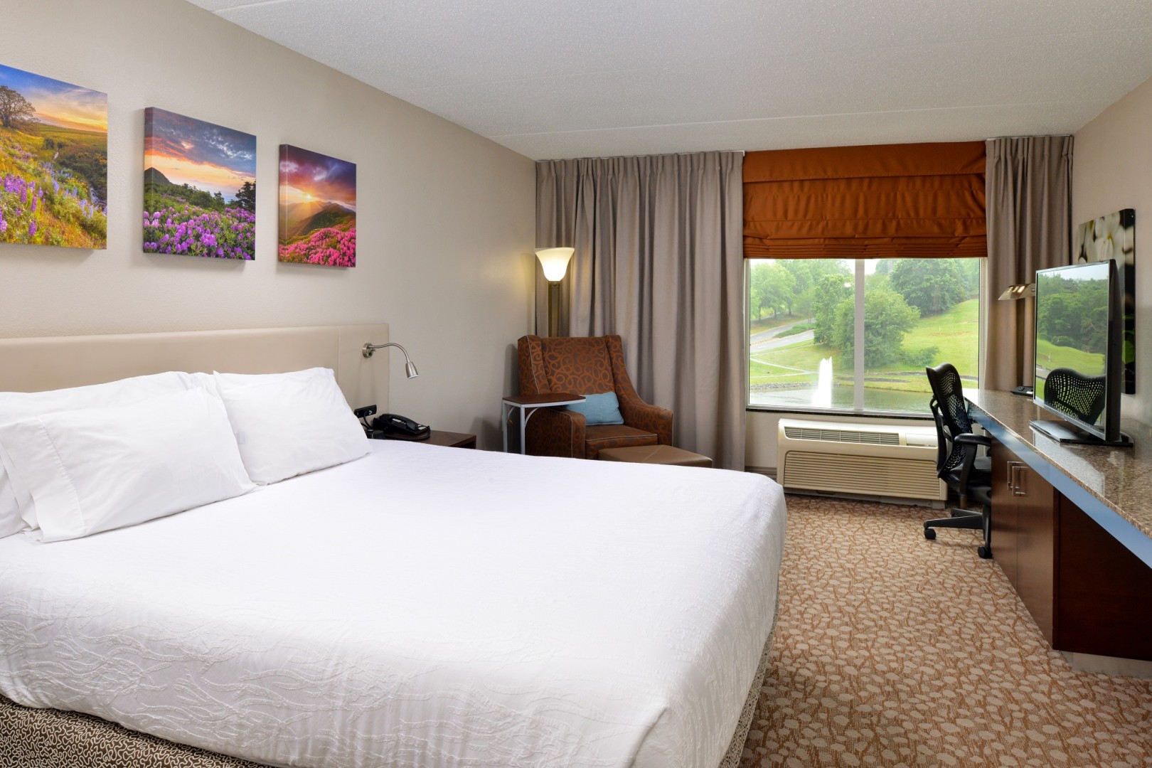 Feel at home in our newly renovated guest rooms, meeting spaces, an inviting patio, firepits, beautiful lake and walking trails at the Hilton Garden Inn of Charlottesville overlooking the Blue Ridge Mountains. Our bright hotel is conveniently located one mile off of Interstate 64 and was designed to offer every amenity that the business or leisure traveler may need under one roof. Eight miles of paved walking trails surround the hotel providing an outdoor fitness option to guests. Spacious guest rooms and suites include a flat screen TV with on demand movies, video games and complimentary HBO, refrigerator, microwave, Keurig coffeemaker, iron, and board. Breakfast is served in our bright dining room. Complimentary amenities include 24 hour access to our business center, wireless high speed Internet, indoor pool, spa, and fitness facility. Pets are welcome. 1600 square feet of divisible meeting space to accommodate up to 100 guests. Our beautifully appointed board room offers a comfortable private space for smaller meetings. Whether it's business or pleasure, the Hilton Garden Inn has everything, right where you need it!