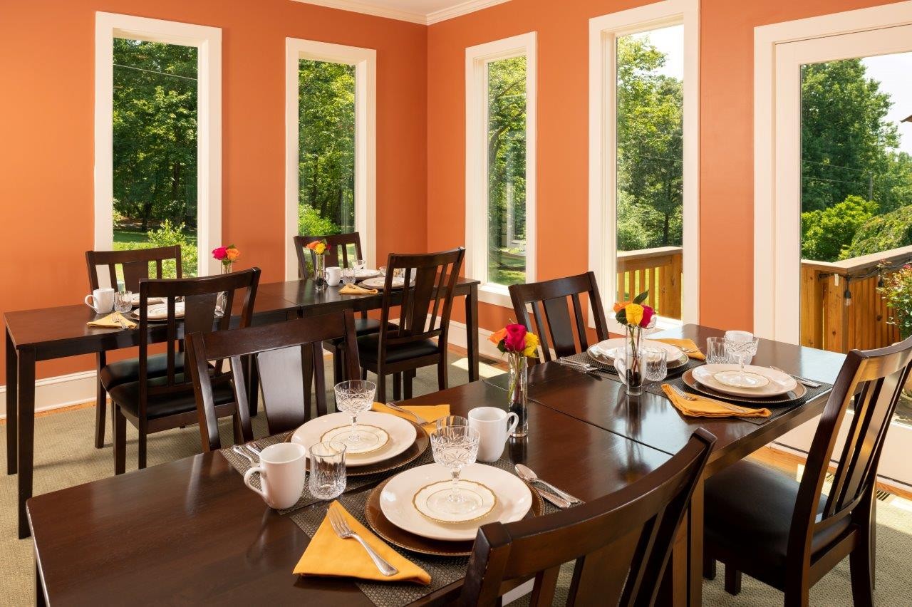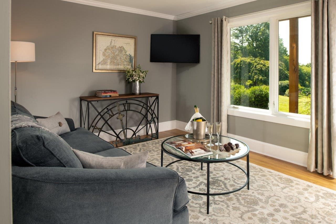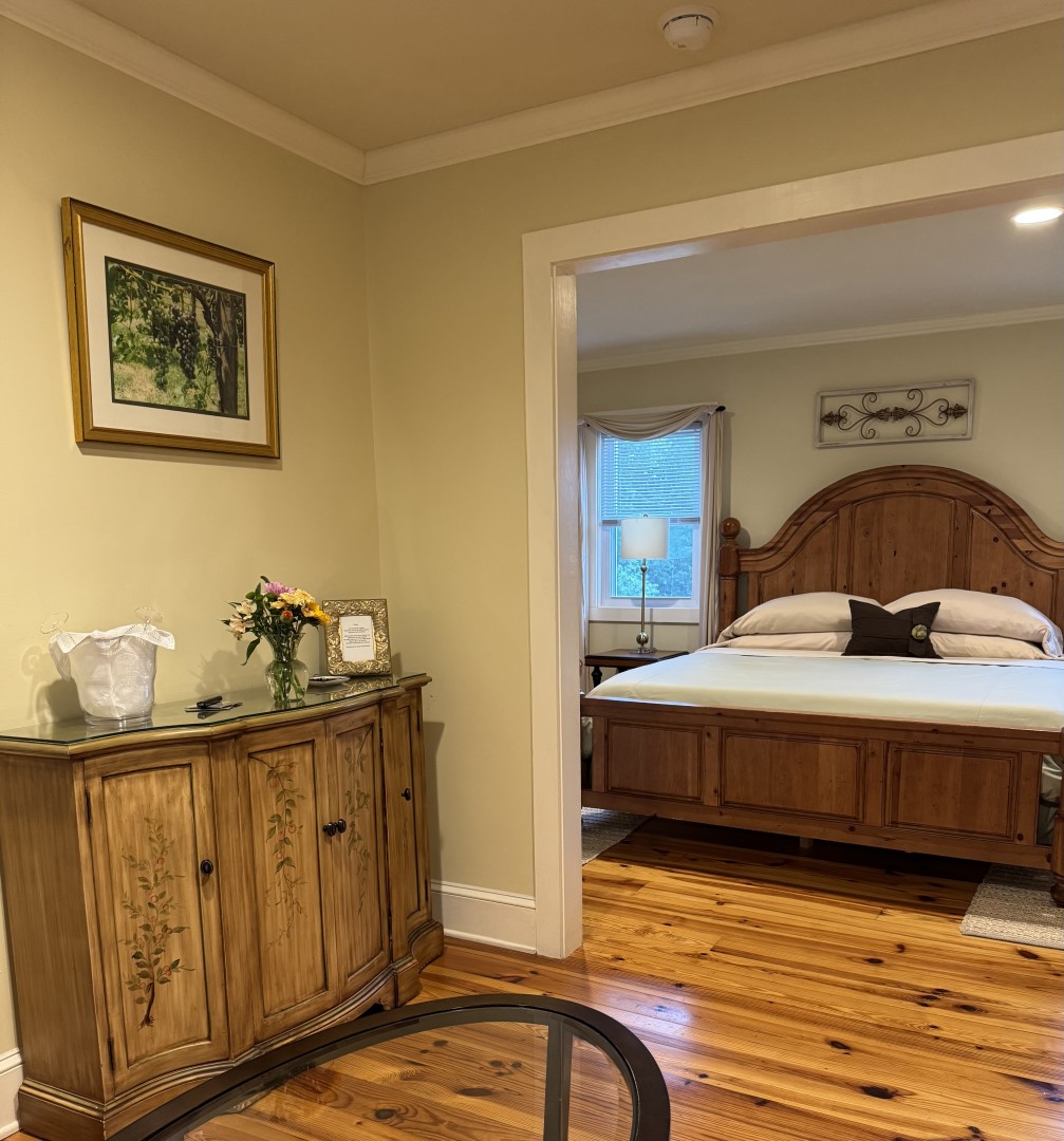Guests enjoy refined, arts-and-crafts–style accommodations with vineyard views and wine-country touches throughout. Each guest room features a private en suite bath, plush robes, towel warmers, heated tile floors, SMART TV, individual thermostat, and a wine fridge stocked with sparkling wine and other beverages. Upon arrival, each guest is greeted with port and local artisan chocolate in their guest room. Select rooms offer a two-person whirlpool tub and remote-controlled fireplace. Mornings begin with a farm-fresh, locally inspired breakfast served at individual tables—unhurried, personal, and memorable.